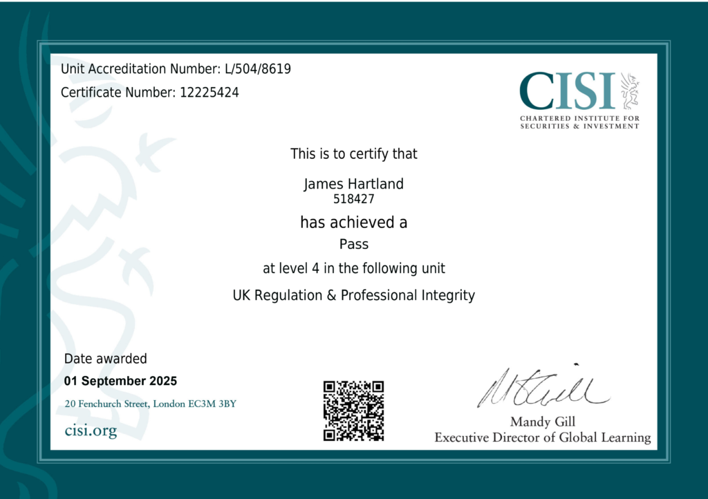 James Hartland has Passed Level 4 under the CISI – UK Regulation & Professional Integrity for the period 01 Sept 2025. This certification reflects his commitment to continuous learning and professional growth in the financial sector.